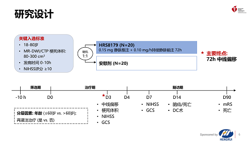 本研究是一项多中心、随机、双盲、安慰剂对照的II期临床试验。研究纳入发病10小时内,基线NIHSS评分≥10分的LHI患者。筛选合格的受试者以1:1的比例随机分入HRS8179组或安慰剂组。研究的主要终点是第72小时中线移位相对基线的变化。研究流程见图1。