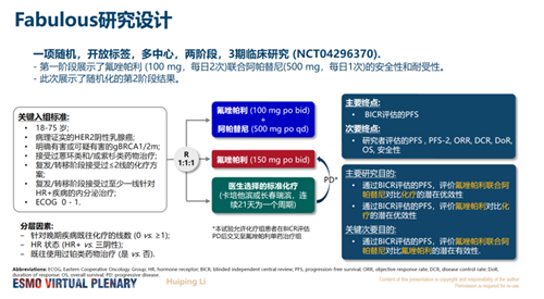 本研究不仅采用了对标国际标准PARP抑制剂单药治疗方案,还进一步在PARP抑制剂单药的基础上开创了氟唑帕利与阿帕替尼的联合治疗方案,丰富了临床治疗选择。氟唑帕利单药及联合阿帕替尼已成为国内第一个在晚期乳腺癌治疗领域获批的PARP抑制剂以及治疗组合,为临床应用增添新的治疗方案。